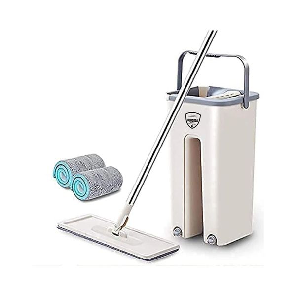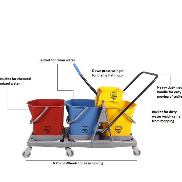 3X20 LTR BUCKETS, 1 COTTON WET MOP REFILL 350 GSM, 6 WHEELS, 1 BLUE WET MOP CLIP WITHOUT HANDLE, 1 HANDLE, 1 CLIP